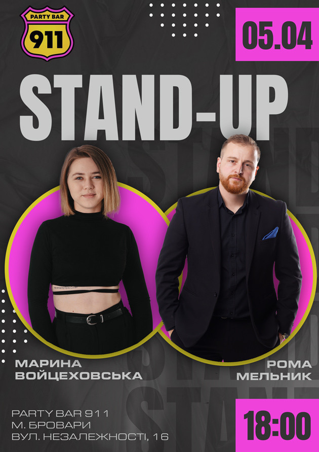 Стендап від Романа Мельника та Марини Войцеховської в Party Bar 911 - це ваш ідеальний вечір, де ви зможете насолодитися смачними напоями та посміятися від душі.